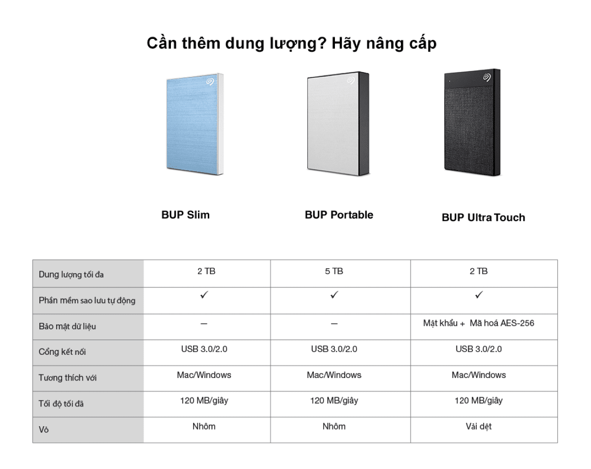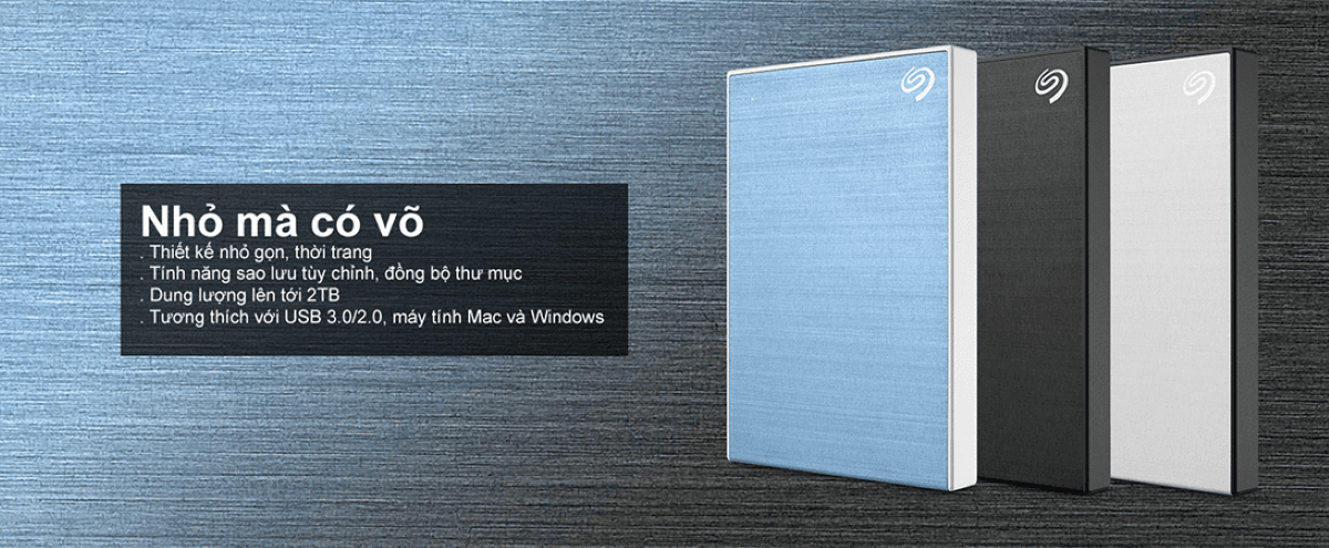 - Ổ cứng di động HDD: Seagate Expansion Portable Drive , Seagate Backup Plus, Seagate Backup Plus Ultra Touch. Với các dung lượng từ 1TB đến 5TB (tuỳ theo dòng sản phẩm)